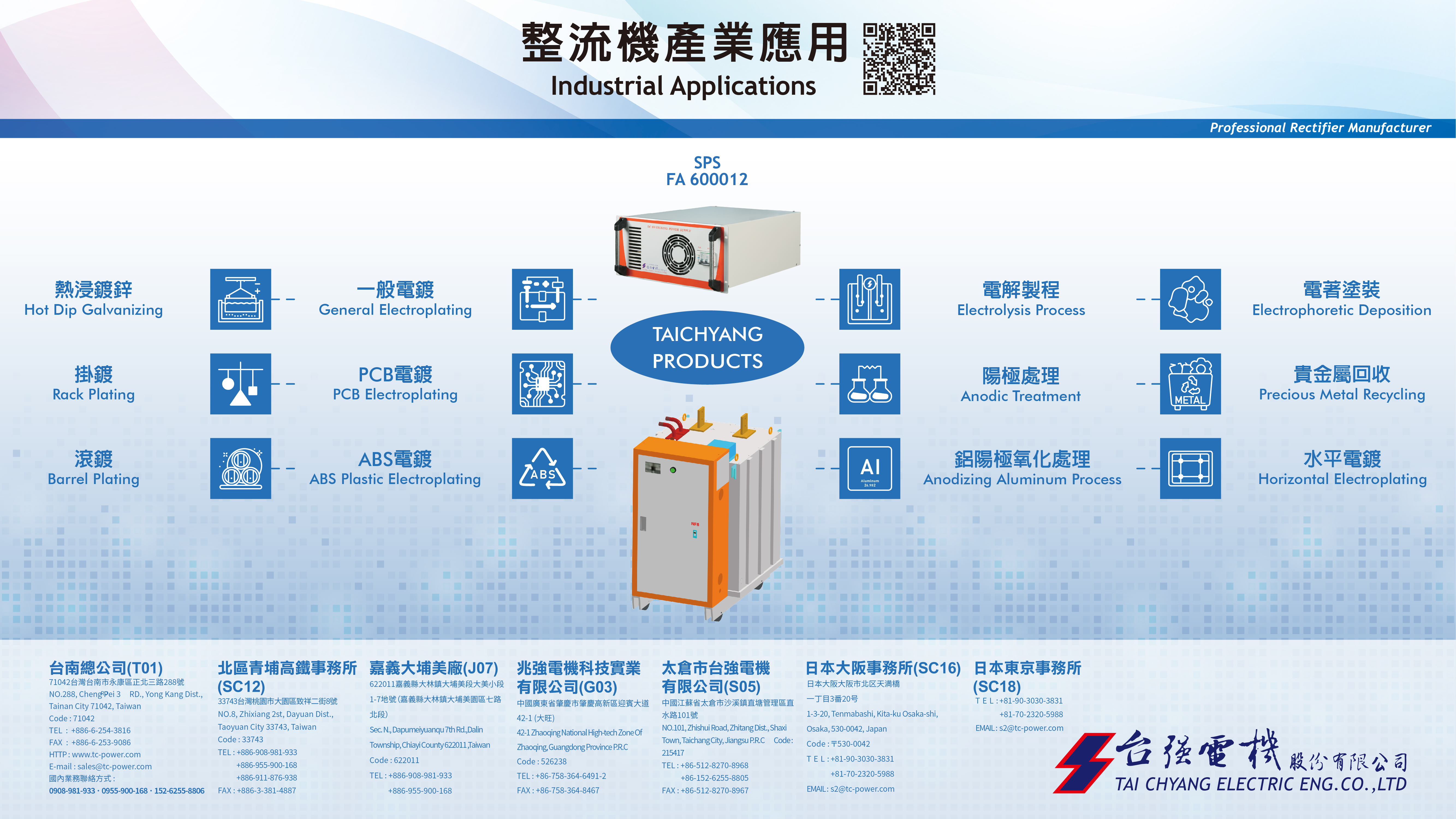 專業(yè)整流機製造 電鍍/電解 /陽極/PCB/鍍金/鍍銀 臺灣整流機最大規(guī)模製造廠 整流器の専門メーカー 整流器專業(yè)製造廠 矽控整流器(Silicon Controlled Rectifier) IGBT Controlled Rectifier 表面處理種類整流器 Power supply 熱浸鍍鋅整流器 hot dip galvanizing Power supply ABS塑膠電鍍整流器 Abs plastic electroplating Power supply 電鍍整流器 Electroplating power supply 掛鍍整流器 Rack Plating Power supply 滾鍍整流器 Barrel Plating Power supply 電鍍整流器 Electroplating Power supply 電解整流器 Electrolysis, Electric Analysis Power supply 陽極處理整流器 Positive Electrode Power supply 鋁陽極氧化處理整流器 Anodizing Aluminium Process Power supply 電著塗裝整流器 Electrophoretic Deposition Power supply 貴金屬回收整流器 precious metal recycling power supply 水平電鍍 Horizontal PCB電鍍 Printed circuit board 矽控整流器(Silicon Controlled Rectifier) 油水冷式 Oil water Cooling 風冷式 Air cooling 風水冷式 Air water Cooling